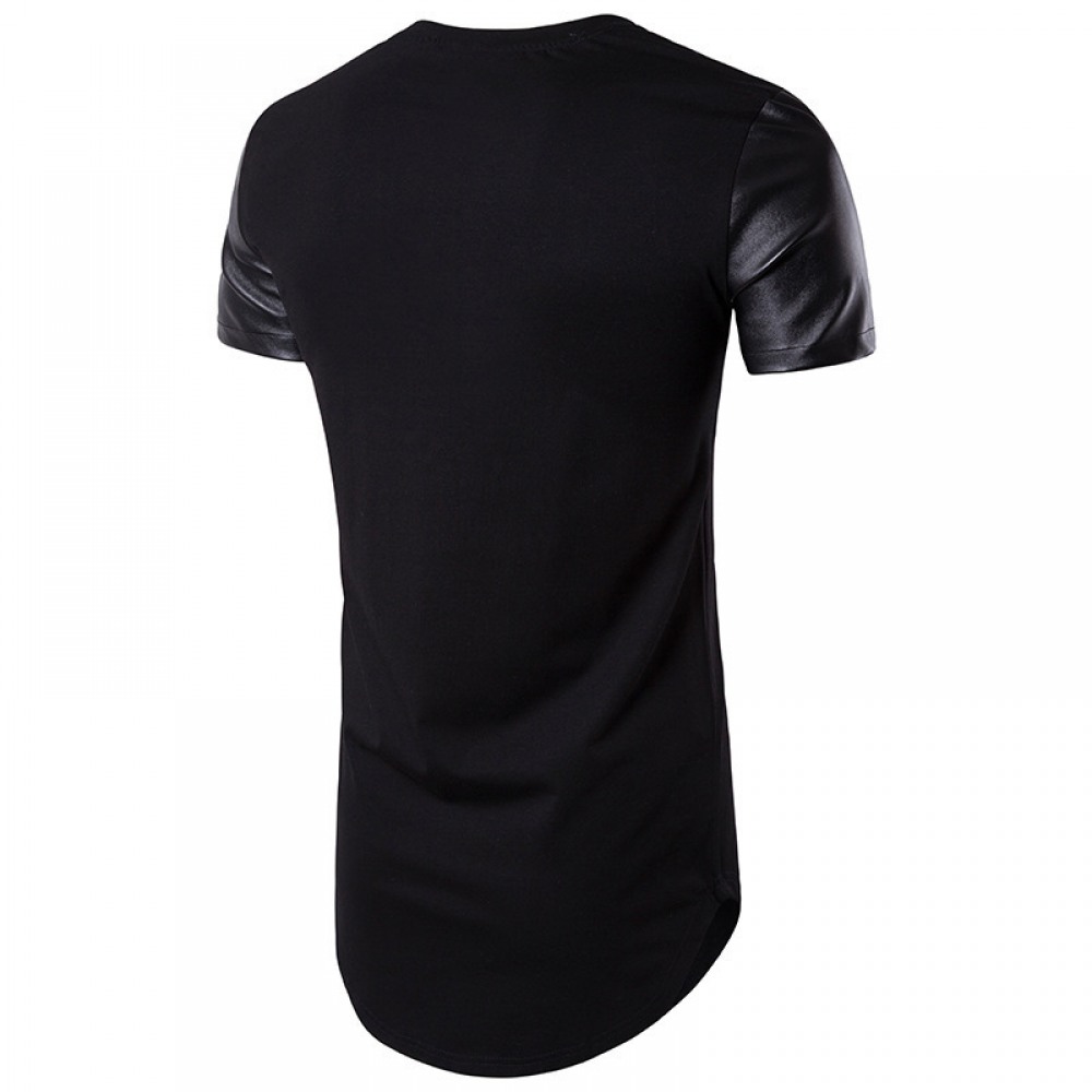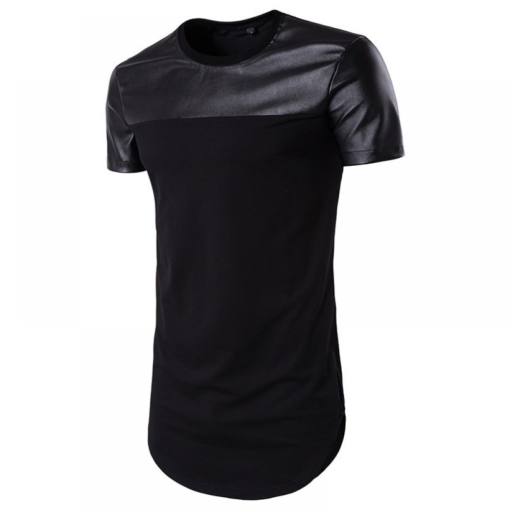 Men's Round Neck Short-Sleeved High Street Arc Hem Solid Color Leather T-Shirt