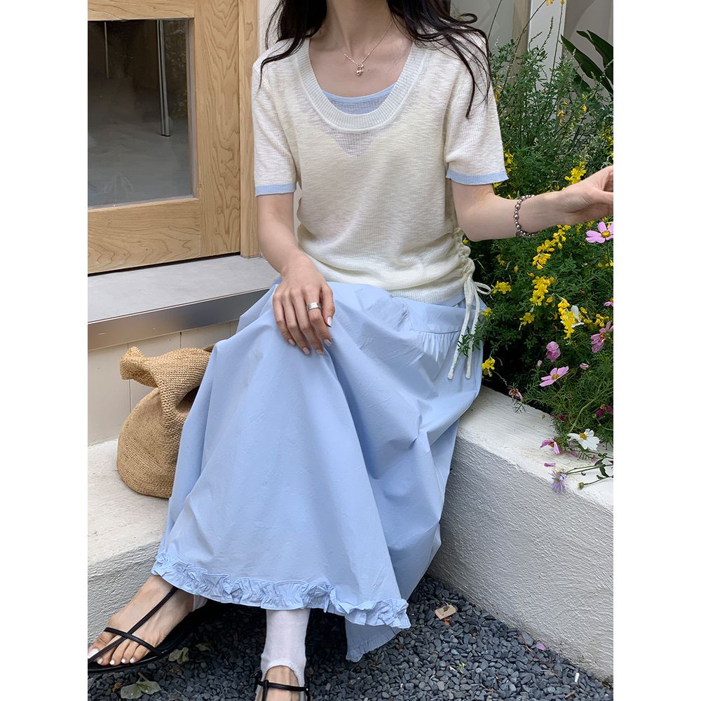 Round Neck Short Sleeve Knitted Sweater Women's Pleated Waist Slim T-Shirt Top